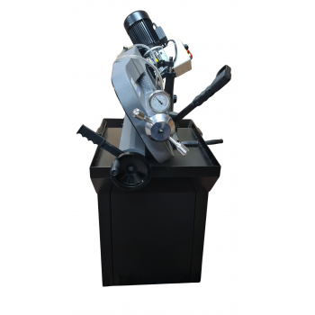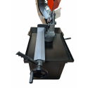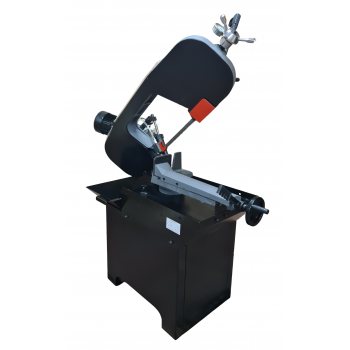 Horná časť základne je tvarovaná ako vaňa na zachytávanie chladiacej kvapaliny a triesok vznikajúcich počas rezania. Na podnoži je upevnený liatinový pracovný stôl s otočným ramenom a ovládacím panelom umiestneným priamo na ramene. Rezanie prebieha pohybom pásu a plynulým spúšťaním ramena, pričom rýchlosť klesania je regulovaná hydraulickým pohonom.